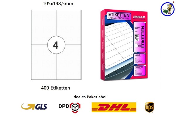 1 Paket = 100 DIN A4 Blatt mit 400 Drucker-Etiketten der Marke HEISAP in den Abmessungen 105×148,5mm.