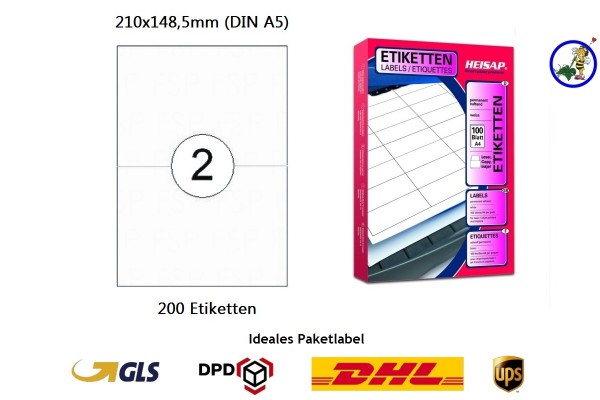 1 Paket = 100 DIN A4 Blatt mit 200 Drucker-Etiketten der Marke HEISAP in den Abmessungen 210×148,5mm.